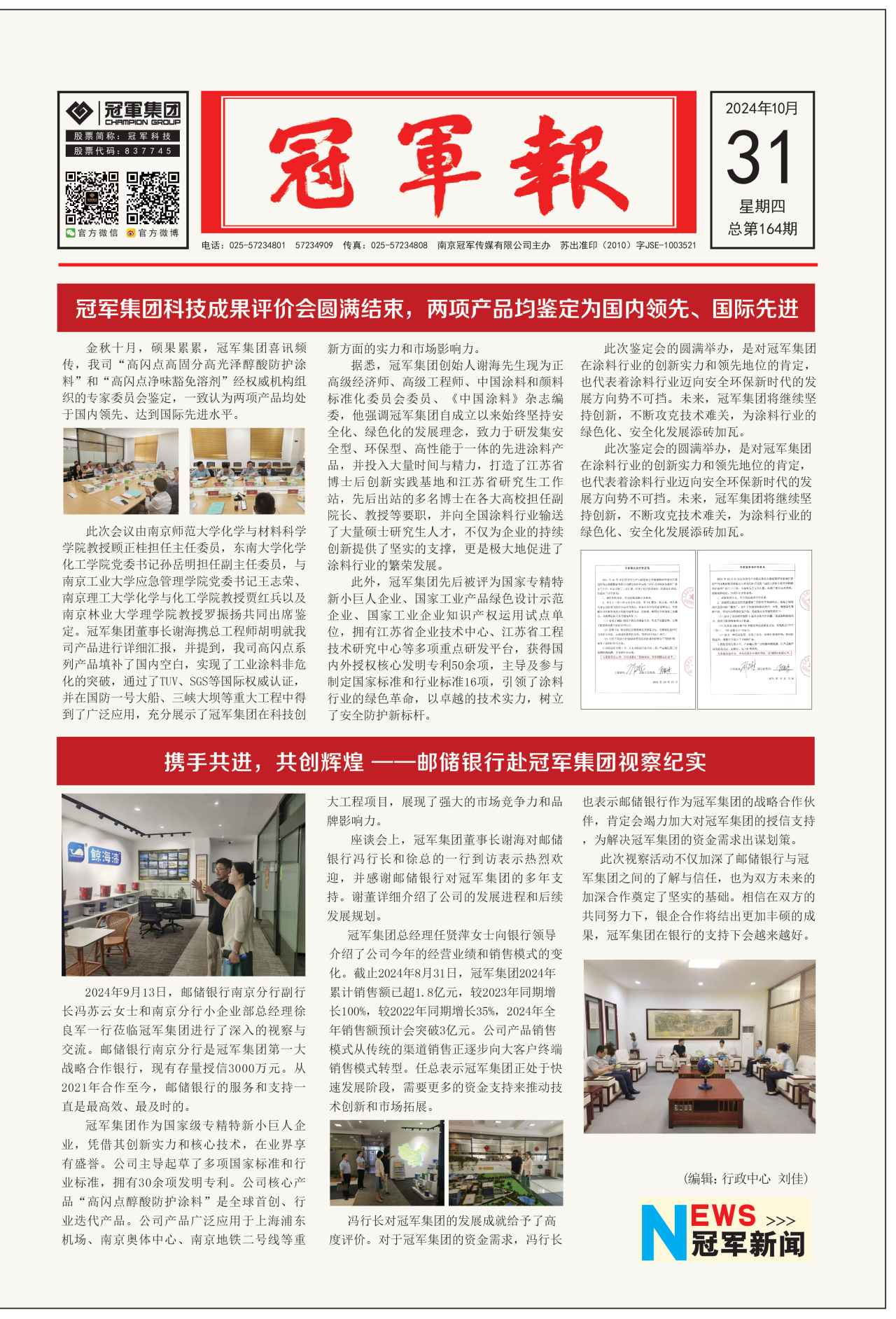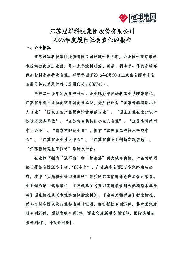 江蘇冠軍科技集團股份有限公司創建于1999年,經過創業團隊20年的努力奮斗,集團已成為國內著名的、以工業涂料研發、生產、銷售為一體的高科技企業。2016年6月30日,冠軍集團在全國中小企業股份轉讓系統掛牌(股票代碼:837745)。